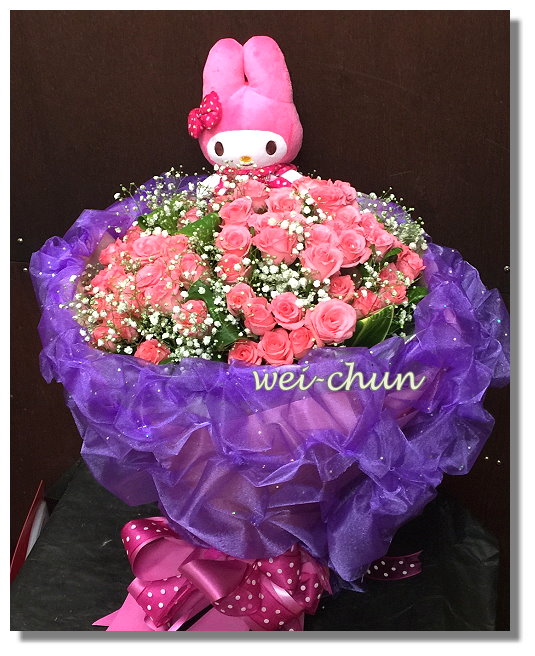 花材:玫瑰+滿天星+葉材+美樂蒂玩偶一隻