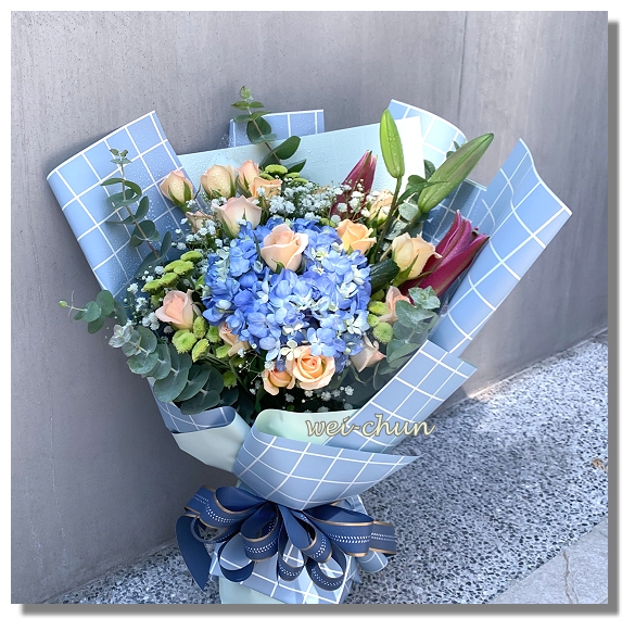 花材:繡球花+玫瑰花+百合+葉材