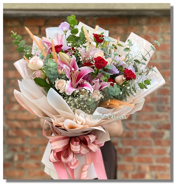 花材:百合+玫瑰花+滿天星+葉材