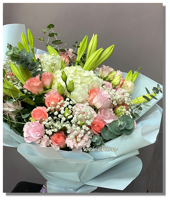 A244 有你陪伴 玫瑰百合繡球花束 新竹代客送花